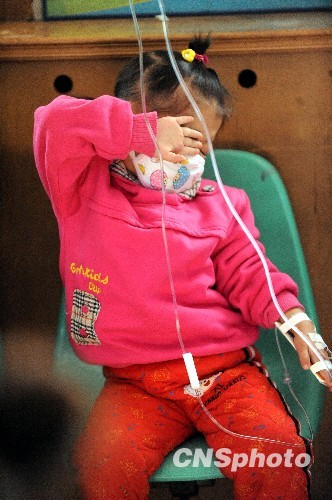 10月22日,患儿在辽宁沈阳市儿童医院输液。冷空气造访,气温骤降,沈阳市各大医院的季节性流感接诊量明显增加,尤其是婴幼儿成为流感侵袭的重点人群。中新社发 罗澜 摄