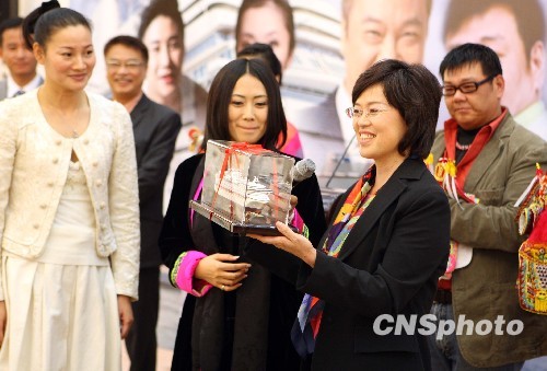 十月二十八日,一部以小三通为时代背景,讲述在金厦直航码头边的“老榕树客栈”和“天天来大酒店”接连发生的种种人间悲情故事的百集时装系列单元连续剧《船来船往》在北京开机。该剧是在《告台湾同胞书》发表三十年之际,就当前如何加强两岸民众的思想交流,弥补长期隔阂的民生民想尤为重要的背景下创作完成。来自台湾的导演连春利携演员吴孟达、杨斯、张浩天等出席仪式。香港演员吴孟达更是近年来首次接演内地的电视连续剧。图为国台办新闻局副局长范丽青(右)向《船来船往》剧组赠送纪念品。中新社发 任海霞 摄