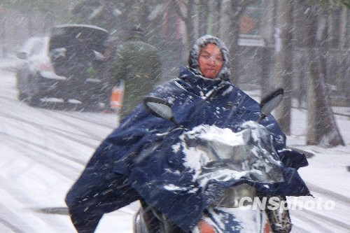 11月11日下午,河南省开封市街头人们冒着大雪行进。当日下午,受强冷空气影响,河南省开封市大雪纷飞,给市民出行带来不便。中新社发 李俊生 摄
