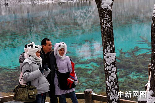 16日,一夜大雪给九寨沟的长海、五彩池、天鹅海、五花海等都披上了冬装,山下湛蓝的海子,山脚缤纷的红叶,山上多姿的雾松,让游客饱览无余。在海拔较高的长海、箭竹海等景点,堆起了近10厘米厚的雪,游人们兴奋地打雪仗、堆雪人,和雪人合影留念。目前,九寨沟旅游进入了淡季。从11月16日开始执行的淡季门票价(80元/人),也让旅游者感到惊喜。苏杰 摄