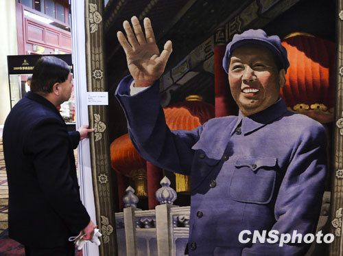 11月20日,一幅生产于20世纪70年代的毛泽东像挂毯亮相北京北纬拍卖会场,吸引观众目光。中新社发 廖攀 摄