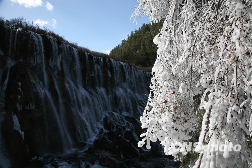11月22日,连续几天的大雪,让“童话世界”九寨沟银装素裹。22日天一放晴,树正、诺日朗、珍珠滩、箭竹海等瀑布前,每棵树都吊起了冰挂,树桠全给冰凝住了。离瀑布最近的几棵柏树还挂起了冰葫芦,就像一串串的白葡萄,在阳光的照射下,熠熠生辉。