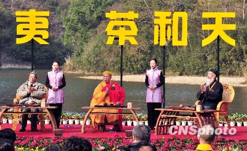 12月6日,儒、释、道三位泰斗在武夷山玉女峰前品茗论茶。中华孔子学会会长汤一介(左)、中国佛教学会会长一诚法师(中)、中国道教学会会长任法融(右)齐聚武夷山玉女峰脚下,阐释“茶和天下”的中华传统文化之精髓。期间第三届中国(武夷山)国际禅茶文化节在武夷山举行。中新社发 张丽君 摄
