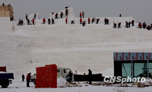 12月7日,哈尔滨太阳岛雪博会主塑“盛世欢歌”开铲。第22届太阳岛雪博会以“雪舞太阳岛·欢乐中国行”为主题,其中巨型雪雕“盛世欢歌”长120米、宽9米、高22米、总用雪量达两万余立方米,成为本届雪博会最大主塑。 中新社发 姚庭山 摄