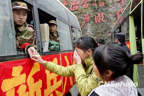 12月11日,重庆市丰都县三坝乡余铁兰送儿子陈江川参军入伍。当日,来自重庆市丰都县的新兵告别故乡,起程奔赴军营。中新社发 朱志斌 摄