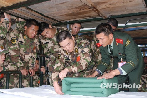 12月11日,武警福建总队直属支队的大学生新兵在班长手把手帮教下叠被子。当日,武警福建总队直属支队迎来今冬入伍首批新兵,其中包括12名具有本科以上学历的大学生新兵。今冬,中国内地13万大学生怀揣着绿色梦想走进军营,开始军旅生活。中新社发 曾朝群 摄