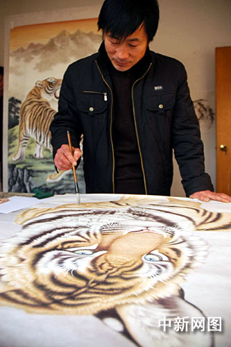 中新网周口12月18日电 (记者 齐永 通讯员 杨正华)12月17日,农民画家马义畅在赶制虎画作品,迎接虎年到来。河南省淮阳县新站镇有个书画家庭,以马义畅兄妹五人为主的农民画家在当地很有名气,特别是马义畅和马志远的工笔虎画作品,远近闻名,作品曾被新加坡、奥大利亚、香港、日本、美国等国际友人收藏。在马义畅的带动下,村里的农民也开始学习画虎,冬闲增加收入。