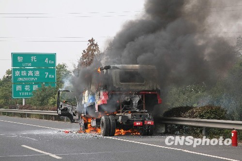 12月22日上午,长沙机场高速黎托段一辆福田货车突然发生自燃,司机及时下车没有受伤。但因火势猛烈,极有可能发生油箱爆炸,随后车辆司机均不敢靠近,造成路面拥堵。据货车司机介绍,自燃可能因线路起火所致。中新社发 白祖偕 摄