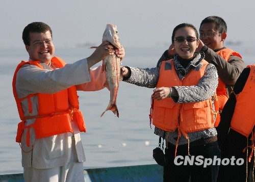 12月25日,二十个国家的驻华使节参加云南江川开渔节,与当地渔民一起捕鱼。图为突尼斯驻华参赞马盖斯喜获“丰收”。中新社发 苏丹 摄