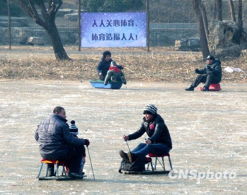 12月28日,游客在尝试各种冰上运动。北京紫竹院公园的北小湖冰场已开始营业,吸引了众多冰上运动爱好者。中新社发 玉龙 摄