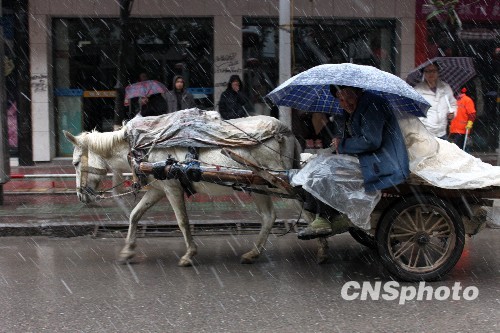 1月5日,寒流来袭,湖南省湘西州龙山县普降大雪,气温大幅下降,给人们出行带来了不便。这是入冬以来最大一场降雪。中新社发 唐荣沛 摄