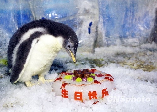 2010年1月7日,哈尔滨极地馆南极企鹅曼波的宝宝过满月。极地馆的工作人员特意为它们准备了用磷虾和墨鱼做的“生日蛋糕”,更邀请了“极地动物明星娱乐盛典巡游团”为生日会助兴,一起过度了一个温馨快乐的生日。中新社发 姚庭山 摄