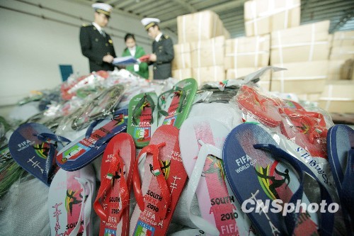 1月8日,一批由福州海关截获的涉嫌侵权2010南非世界杯标识的拖鞋,在福州被依法扣留,这是福州海关首次查获的侵犯“FIFA世界杯”知识产权案件。该批截获的1317双拖鞋,都印有“FIFA WORLDCUP”、“SOUTH AFRICA 2010”等商标字样,经国际足联确认系侵犯了世界杯知识产权。