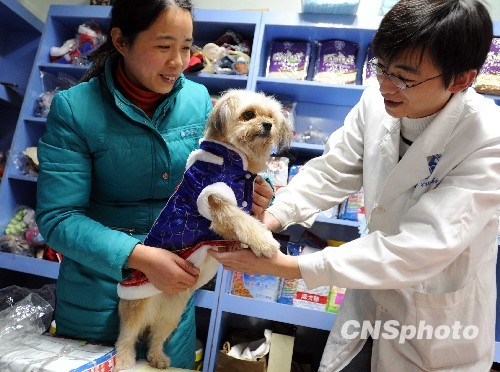 1月8日,一名福州市民携宠物犬来到社区宠物医院专门设立的宠物用品专卖区,给爱犬试穿款式美观的宠物御寒服饰。连日来,受强冷空气影响,福州低温寒冷,市区一些宠物医院、宠物用品专卖店的宠物御寒服饰虽价格不菲,却十分畅销。中新社发 刘可耕 摄