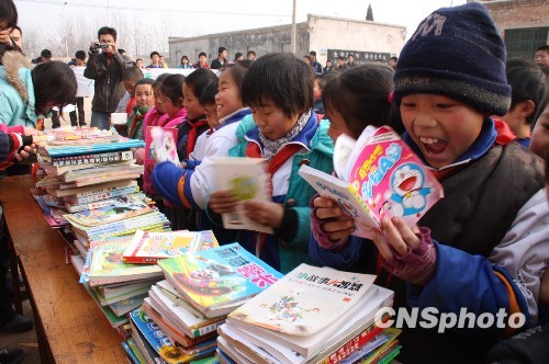 1月18日,由山东聊城大学环境与规划学院组织的“情系农村儿童,图书爱心漂流”社会实践活动,在山东聊城东昌府区凤凰街道办事处张飞小学举行,由聊城大学附属小学的城里孩子捐赠的300余册儿童读物,作为新年年货全部按年级分发到农村孩子手中。 中新社发 孔政 摄