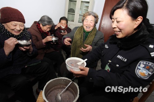 1月20日,河南省许昌市公安局魏都区分局西大派出所榆柳社区民警周瑞特意熬制了香喷喷的腊八粥,邀请社区贫困户、独居老人和“空巢老人”共同品尝。 中新社发 牛书培 摄