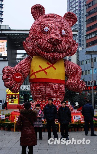 2010年是中国的虎年,1月下旬,由数千个易拉罐搭建成的红老虎伫立重庆街头,引来多数市民拍照留念。中新社发 胡虹 摄