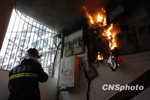1月23日11点15分,湖北宜昌市隆中后路一居民楼电表起火后发生爆炸,楼内居民惊慌不已,急忙报警。宜昌市东山消防中队接警后赶到现场,切断电源,使用灭火器将火扑灭。中新社发 王先申 摄