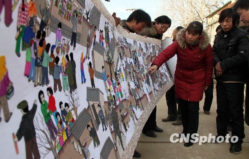 1月22日,河南省内黄县田氏镇汤东村李红云展示自己创作的堆绣作品《豫北民俗过年》。 今年30多岁的李红云从2006年开始,以所在村子为背景,以豫北农民年俗为内容,创作出一幅长28米,宽0.8米的堆绣作品《豫北民俗过年》。该作品以时间为顺序,生动再现了豫北农民从农历腊月二十三到正月十七请灶爷、磨豆腐、吃麻糖、爆米花、备年货、蒸馒头、贴春联、拜大年、走亲戚、看焰火、赶庙会过年的场景。画中人物共1396个,衣着、神情各不相同,作品构图疏密有致、色彩鲜明、立体感强,令人叹为观止,堪称民俗版“清明上河图”。 中新社发 常中正 摄