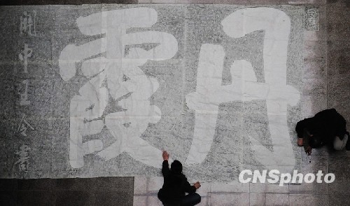 一月二十七日广东丹霞山管委会对外宣布,在第三次中国文物普查中,丹霞山又发现了秘藏于山中的摩崖石刻、千年岩画和岩棺等极具研究价值的文物。目前,中山大学仇江教授一行七位拓片专家,目前正带领丹霞山风景区监测中心全体人员就景区难度大、位置高的十七处摩崖石刻展开第三阶段的拓片工作。中新社发 胡浩萍 摄