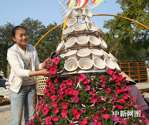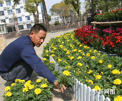 2月l日,福建东山县园林工人正在当地人民会堂门口广场花架上摆放2500多盆鲜花。春节临近,台胞祖地东山县加紧在公共场所、景区景点陆续摆放鲜花30万多盆,为新春佳节营造了美化、喜庆、欢乐、祥和的浓烈氛围。谢汉杰 摄