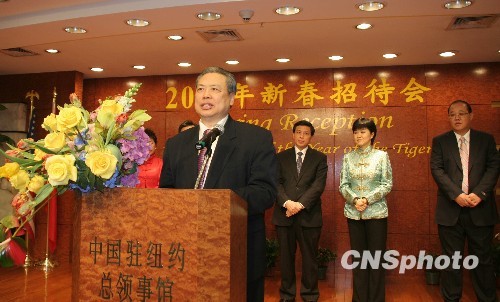 当地时间2月3日晚,中国驻纽约总领事馆、中国常驻联合国代表团联合举办侨界专场春节招待会,与美东地区的华人华侨们同庆新春佳节。图为中国驻纽约总领事彭克玉代表中国常驻联合国代表张业遂大使等,向美东地区所有的侨胞们拜年。中新社发 魏晞 摄