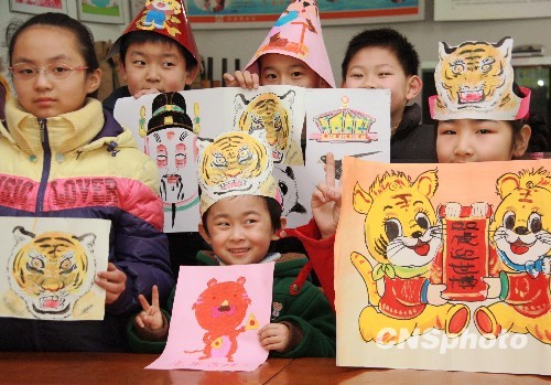 2月4日,小朋友们展示自己的虎画作品。寒假第一天,无锡市南长区妙光塔社区小朋友们在社区老画家的义务指导下画虎迎新年。中新社发 南戈 摄