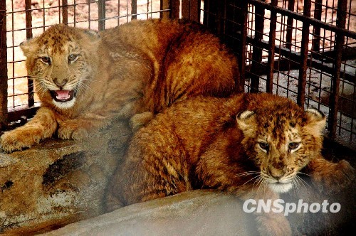 海南热带野生动植物园的一对龙凤双胞胎“虎狮兽”2月9日成功断奶,160天的“虎狮兽”相当于青年了,该园特别为这对奇兽举行断奶“成人礼”,与父母分开它们将开始独立生活,并通过媒体向社会各界为龙凤胎征名。中新社发 王辛莉 摄