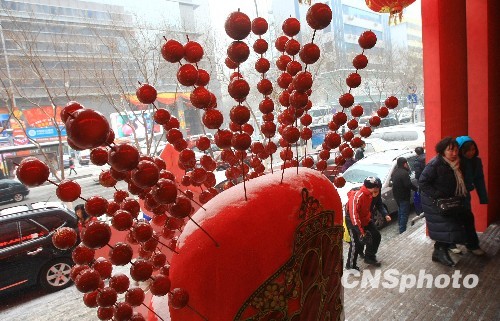 2月9日,市民从新疆乌鲁木齐市街头硕大的“冰糖葫芦”前经过。农历新年——春节即将到来,新疆乌鲁木齐商家为吸引消费者,在商场门前摆出硕大的“冰糖葫芦”模型,营造节日气氛。中新社发 刘新 摄