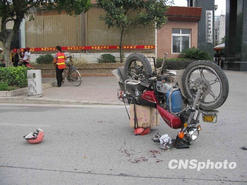 2月10日,广西柳州市桂中大道发生一起车祸,一辆男式摩托车被与一辆轿车相撞,摩托车离奇倒立,车手重伤被送往医院抢救。中新社发 蒙鸣明 摄
