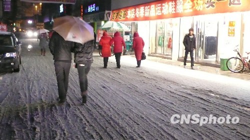 2010年2月10日晚,安徽省亳州市已经连续降雪8个多小时,盐粒状的春雪,扫在行人脸上,隐隐作痛,让行人难以睁开眼睛。中新社发 刘勤利 摄