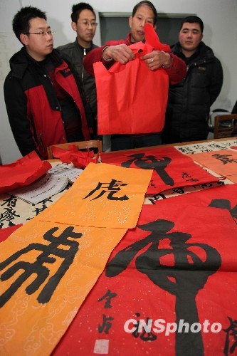 2月11日,河南省禹州市磨街乡黄沟村村民苏全占用手撕纸的形式创作出楷书、行书、篆书、隶书等书体十余种“虎”字,喜迎虎年新春的到来。45岁的苏全占从小酷爱书法艺术,他临摹书法,用纸撕出不同造型的汉字。经过十多年的苦心揣摩,作品日臻成熟。中新社发 牛书培 摄