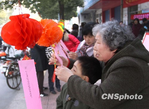 2月23日上午,浙江杭州市某社区开展“猜灯谜”活动,社区居民踊跃参加,街头猜谜。中新社发 张祥荣 摄