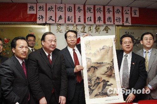 率领“文化中国·四海同春”艺术团刚刚在纽约成功举行演出的中国国务院侨办副主任许又声,3月1日来到纽约唐人街,沿街拜会侨团,与当地侨胞们“面对面”。图为许又声(左三)走访纽约最大的华人社团之一、拥有超过2万会员的福建同乡会,并与福建同乡会主席郑棋(右二)等互赠礼品。中新社发 魏晞 摄