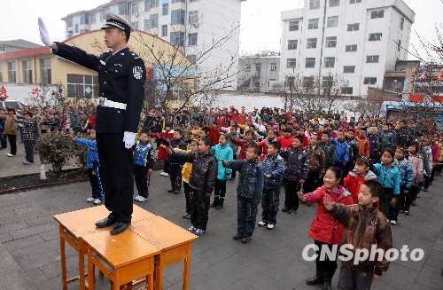 2010年3月3日,一名交警在校园里教同学们交通手势操。当日是山西省盂县中小学2010年春季开学第一天,盂县公安交通警察大队组织交警深入该县秀水镇南村小学开展“开学第一课”活动,普及交通法规和交通安全常识,向同学们赠送200幅交通安全知识漫画、卡片,以提高学生们的交通安全意识和自我保护能力,确保新学期学生上学、放学的交通安全。中新社发 程瑜 摄