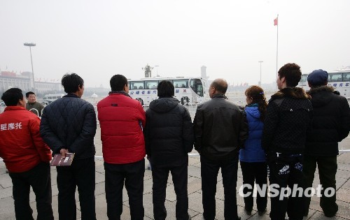 图为在天安门城楼前参观的游客把目光转向了载着全国政协委员的客车。中新社发 刘震 摄