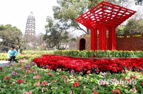 3月17日消息,以“相约世博”为主题的2010年春季苏州虎丘艺术花会将于3月20日拉开帷幕。目前该花会各景点的布展工作正在紧锣密鼓的进行之中,让许多市民及中外游人先睹为快。据了解,花会期间,在面积达1万平方米展会上,所设的六大景点内将有牡丹、郁金香、杜鹃、洋水仙、海棠、仙客来等60多个品种约10万盆中外名花与时令花草陆续登场。其中中国世博年、昆曲脸谱和婚纱摄影大赛、戏曲表演等好戏连台的助游活动将成为本届花会的看点与亮点。中新社发 王建中 摄