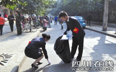 梳高髻头、围花丝巾、穿一步裙标准空姐套装打扮的美女们集体出现在成都街头……昨日,成都市城管执法一分局启动“城管宣传日”活动,30名准空姐、准空少担任志愿者,手拿黑色塑料袋上街捡垃圾(上图),并向市民进行文明劝导和宣传。
