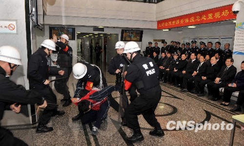 3月19日,上海高院召开世博安保应急处置现场会,以增强此间各法院应急处置各类突发事件能力,规范应急处置指挥程序,完善各项应急预案。现场会上,卢湾区法院模拟演练了“世博应急机动队紧急集结”等五种突发事件情况下的应急处置过程。中新社发 韩承龙 摄