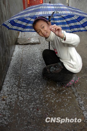 3月21日,一名女孩展示拾到的冰雹。当日16时许,受大面积强对流天气影响,河南省汤阴县入春以来首次遭受强降雨和冰雹袭击。由于冰雹颗粒直径较小且稀疏分散,持续时间较短,对农业生产影响不大。中新社发 张志勇 摄