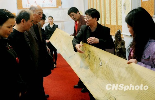 3月23日,长8米、由作者花费三个多月时间创作而成的《佛说大乘无量寿庄严清静平等觉经》书画长卷亮相在福州举办的一个佛教文化书画展,吸引众多书画爱好者眼球。本次展出的近百幅与佛教相关的书画作品,由现为中国书画艺术家交流中心主任委员林钦松潜心创作,内容大多以佛教经文、偈语、禅诗、名句为素材,呈现出静穆、庄严、自然、正大的气象。中新社发 刘可耕 摄