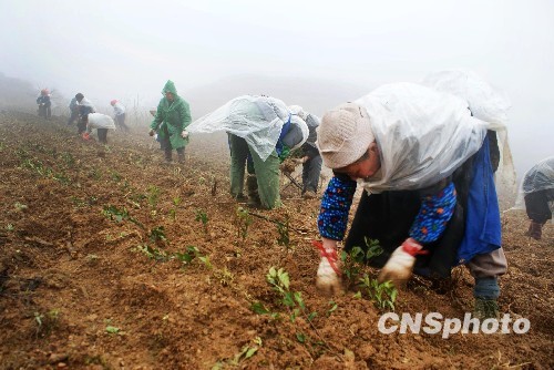 3月23日,贵州印江自治县沙子坡镇的茶农在海拔1000多米的生态茶基地内忙碌。3月22日夜间,该县在峨岭镇、新寨乡开展了火箭增雨消雹作业,当地农民抓紧机会,开始春季茶苗定植和春耕生产。中新社发 谭永贵 摄