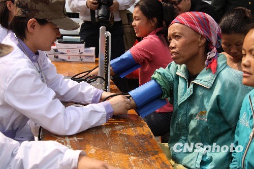 3月25日,位于广西南宁市的解放军三0三医院组织博士医疗队来到广西百色市田东县作登乡陇桃村为当地群众巡诊。专家们针对旱灾容易引起的消化道、皮肤等疾病,为村民看病治病,并讲解相关预防保健知识。中国西南地区特大旱灾至今仍无缓解迹象,中央气象台近日连续发布干旱黄色预警,广西等旱区旱情或将继续发展。中新社发 李嘉财 夏志勇 摄