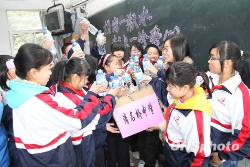 3月26日,江苏无锡清名桥中学团委、红十字会开展“捐出一瓶水、献上一份情”向西南灾区捐水活动。中新社发 盛国平 摄