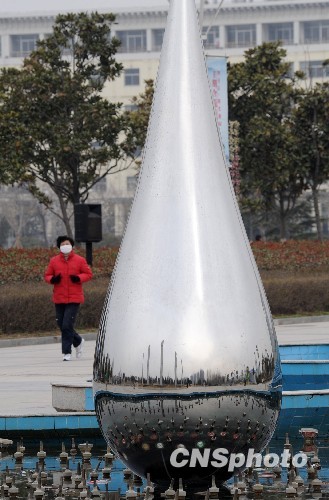 2010年3月27日,一座名为“生命之源”的水滴雕塑在江苏连云港与市民见面。这座水滴雕塑高3.6米,最大处直径1.5米,由不锈钢制作而成,以“最后一滴水”的形象来警示人们节约用水,爱护水资源。中新社发 耿玉和 摄