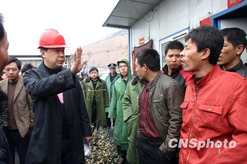 3月29日上午,山西华晋焦煤有限责任公司王家岭煤矿透水事故抢险工作正在紧张进行中。为救援被困矿工,多方支援的抢险器材、矿山救护队已经陆续抵达现场。图为焦急的矿工亲友与抢险指挥部相关负责人交涉。中新社发 张云 摄
