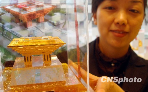 2010年3月30日,苏州观前街一家金店营业员展示千足金“世博中国馆”微缩模型。近日,苏州观前街一家金店推出千足金“世博中国馆”微缩模型,吸引顾客目光。中新社发 王建康 摄