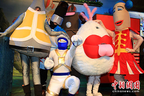 3月31日,2010年上海世博会可口可乐企业馆“美女导游”(右)和快乐精灵们首次亮相。当天,该企业馆设计主题“快乐工坊”揭晓,占地3000平方米的“可口可乐快乐工坊”企业馆将如期开馆,届时,游客们可以从一个巨大的自动售卖机投币口进入展馆,亲身感受新奇创意。中新社发 潘索菲 摄