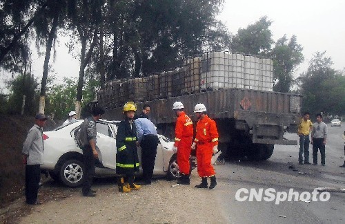 3月31日,广西合浦县往钦州方向二级路段发生一起交通事故,一辆货车与一辆小轿车相撞致1人当场死亡,3人受伤。图为事故现场。中新社发 吕小伟 摄