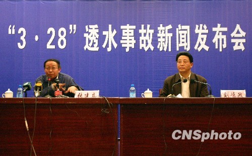 4月1日傍晚,山西王家岭透水事故召开第四次新闻发布会,山西省安委会办公室副主任刘德政在会上向记者通报抢险进度最新消息:排水44200立方米,水位下降95厘米。同时,地面垂直钻孔2号成功打通,即将为井下输送营养品。中新社发 张云 摄